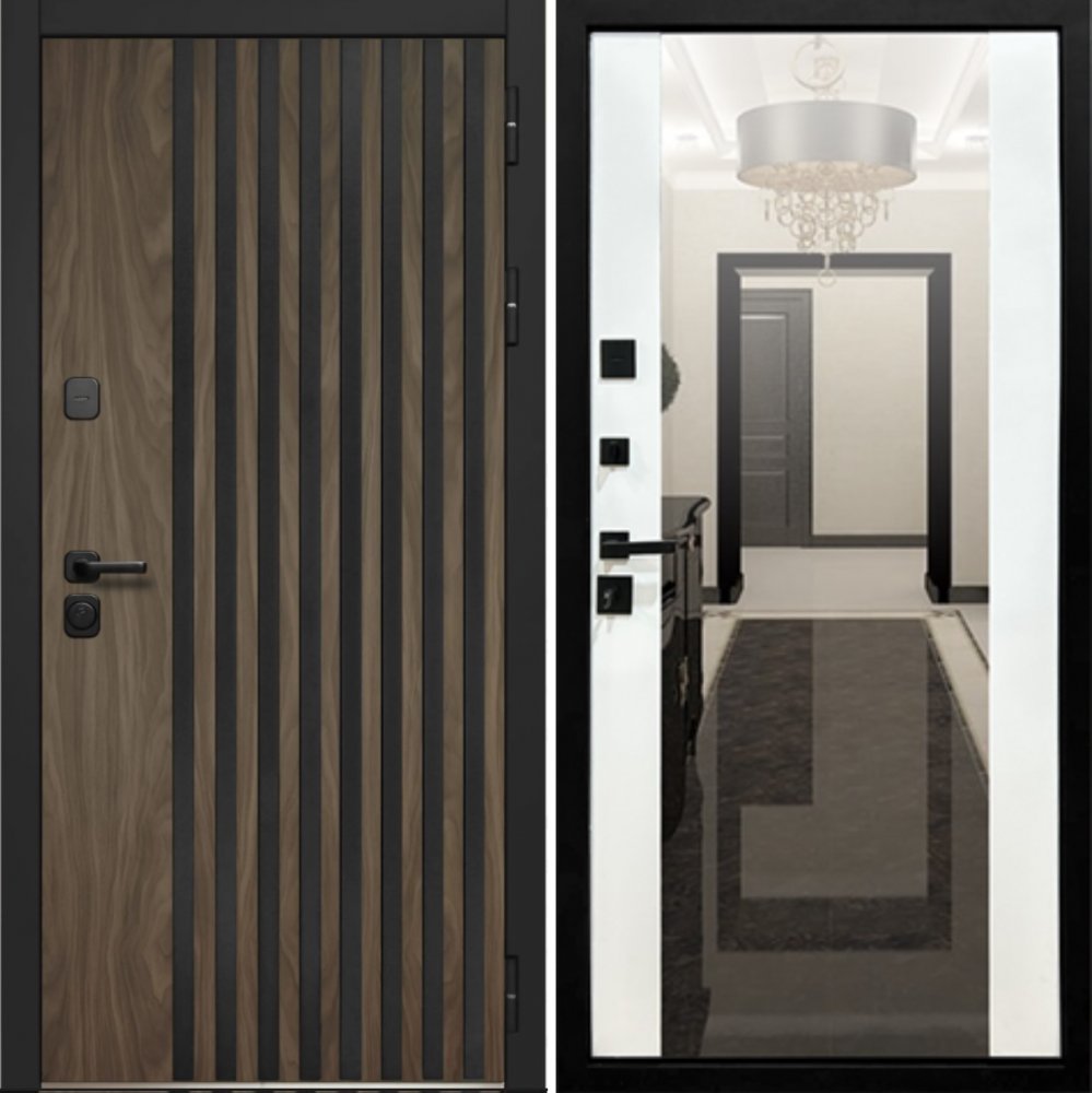 Металл: Порошково-полимерное покрытие, цвет Муар черный Отделка снаружи: лист стали + ламинированная МДФ панель 12мм , цвет Орех Американский мокко, вставка+ наличник Антрацит софт